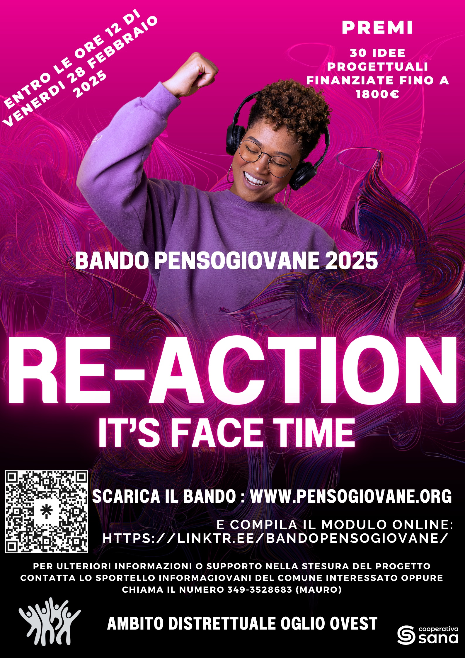 Il bando RE-ACTION rappresenta un’importante opportunità per i giovani per esprimere la propria creatività e prendere parte attivamente al cambiamento della propria comunità. In un’epoca in cui gli stereotipi sui giovani continuano a prevalere, spesso riducendo le loro capacità e le loro aspirazioni a semplici etichette, noi vogliamo ribaltare questa narrazione. Il nostro obiettivo è sostenere e valorizzare le idee progettuali che nascono dal desiderio dei giovani di reagire ad un mondo che, troppo spesso, ignora le loro emozioni e le loro esigenze.