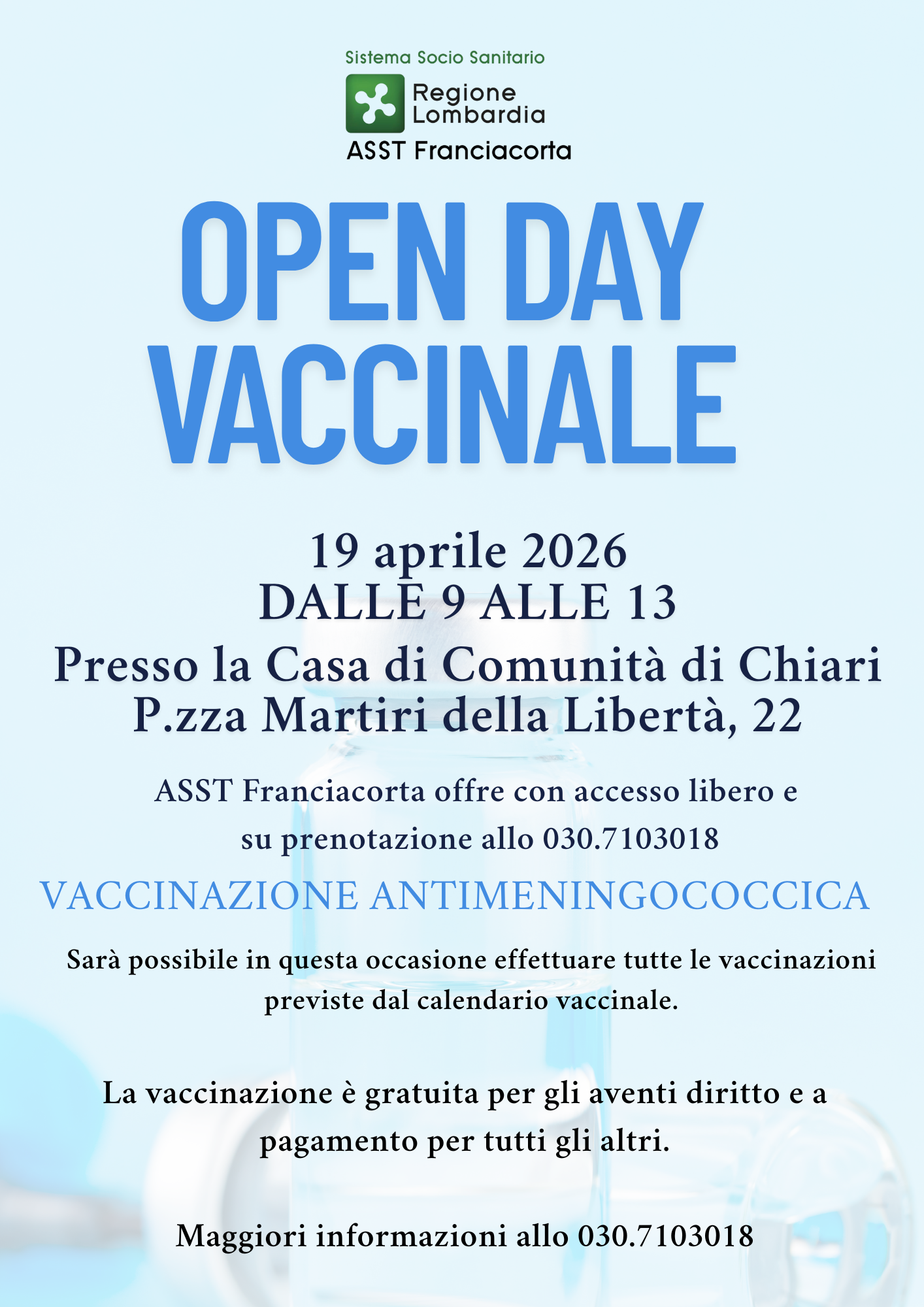Domenica 19 APRILE 2026 - Open Day Vaccinale in ASST Franciacorta presso la Casa di Comunità di Chiari