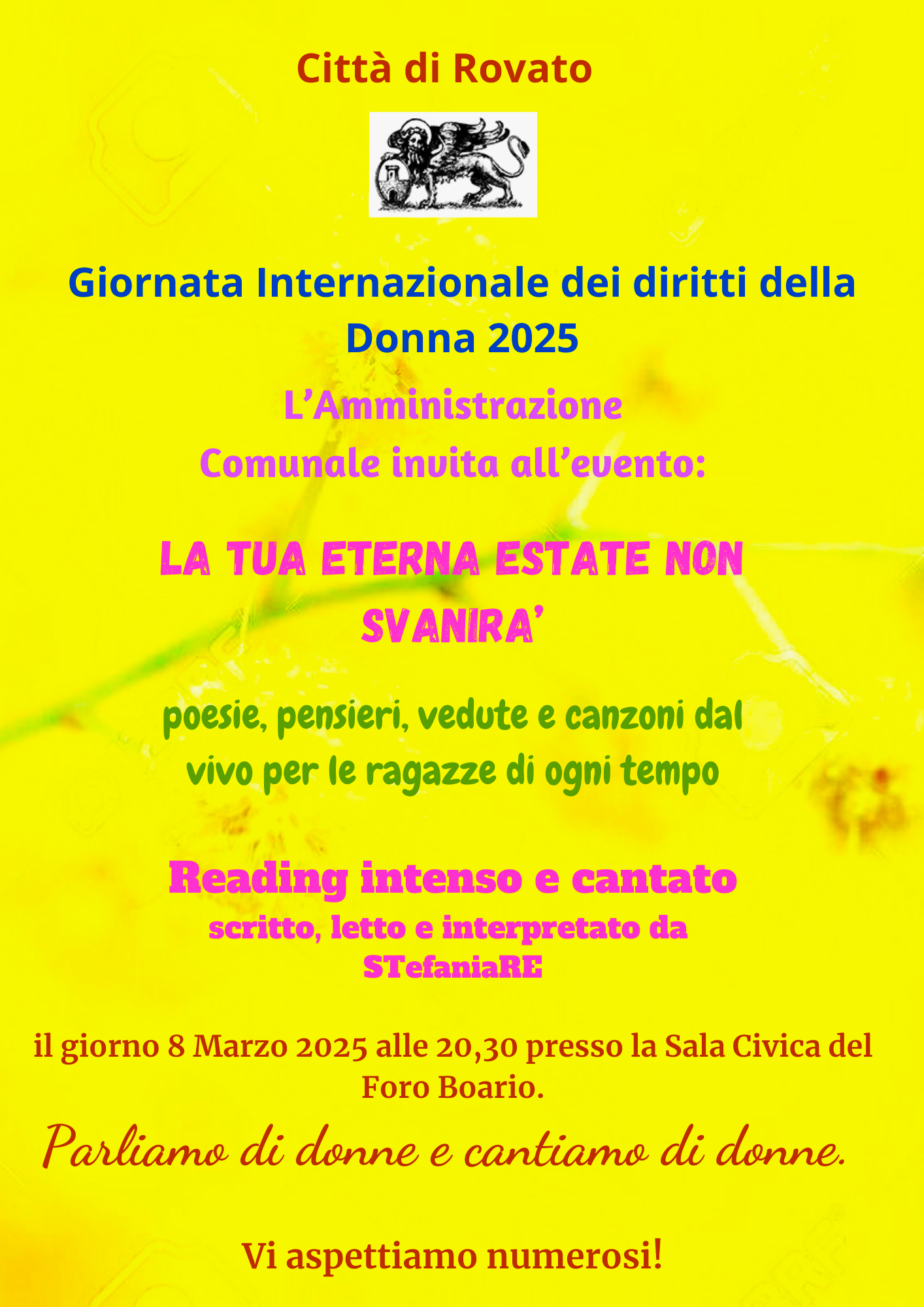 L'amministrazione comunale invita tutti i cittadini all'evento: la tua eterna estate non finirà. Poesie, pensieri, vedute e canzoni dal vivo per le ragazze di ogni tempo. Reading intenso e cantato. Scritto e interpretato da STefaniaRE